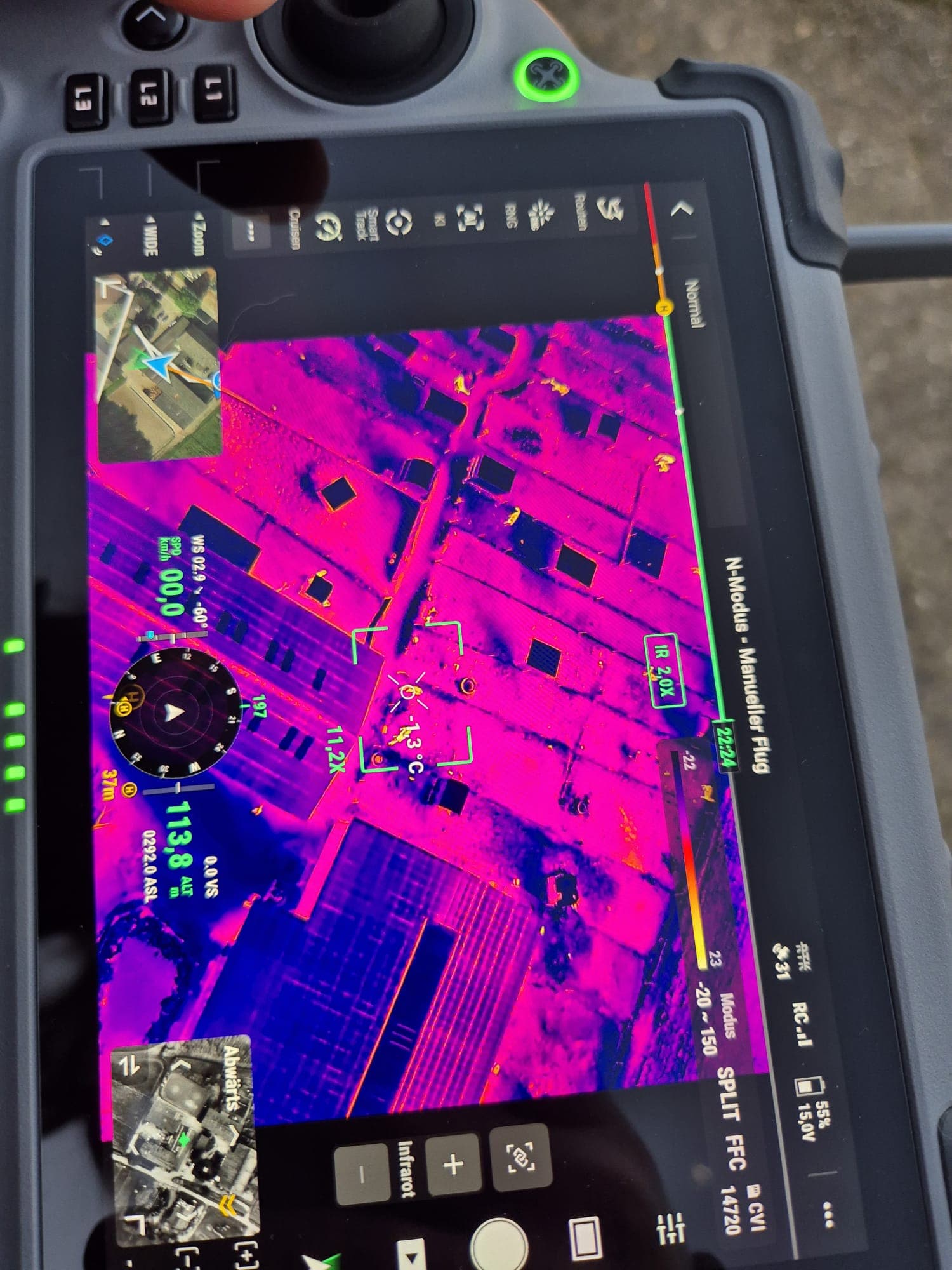 Mit meiner Wärmebilddrohne unterstütze ich bei der strukturierten Suche aus der Luft. Durch die erhöhte Perspektive und die Wärmebildtechnik lassen sich Temperaturunterschiede erkennen, die am Boden nicht sichtbar sind.